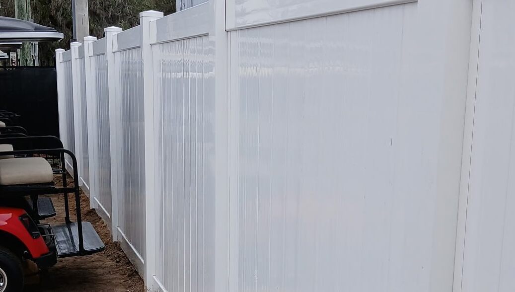 Top Rail Fence just wrapped up a commercial fence upgrade for a local golf cart sales & service business in Ormond Beach. We replaced old wood fencing with a sleek, durable 6’ white vinyl privacy fence and upgraded the chain link roll gate to a smooth-operating vinyl cantilever gate. The results are low-maintenance, weather resistant, secure, and stylish.
