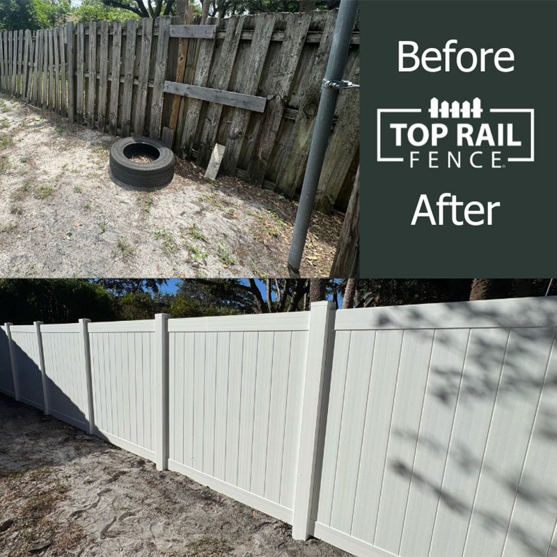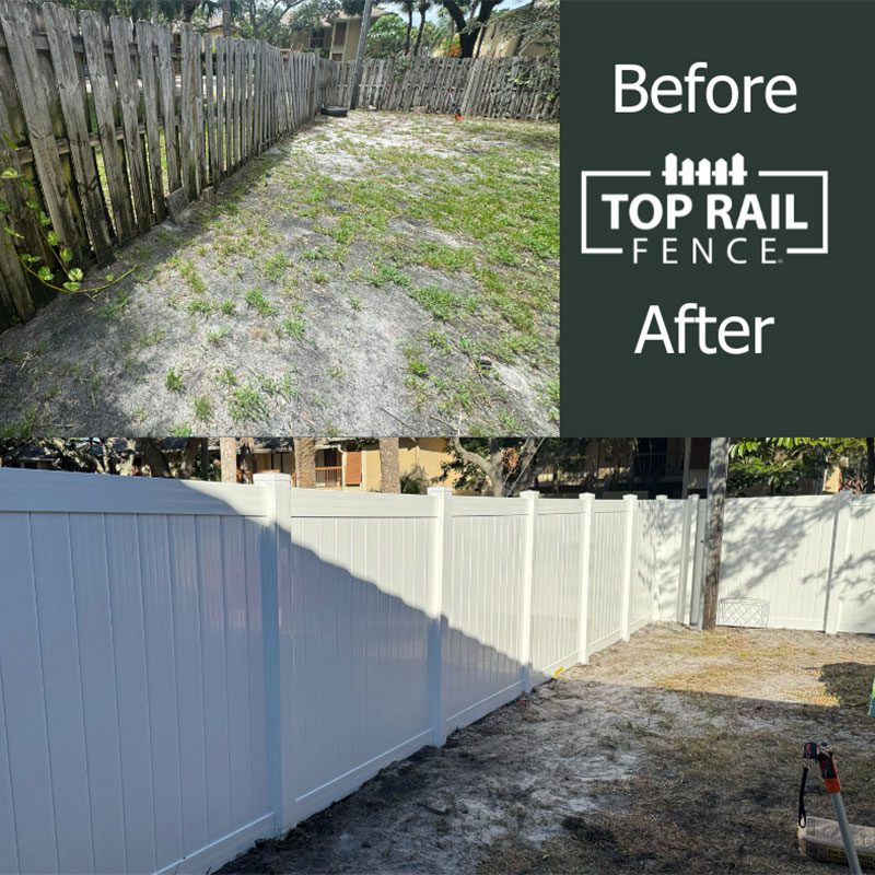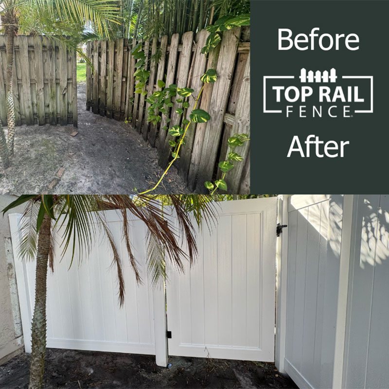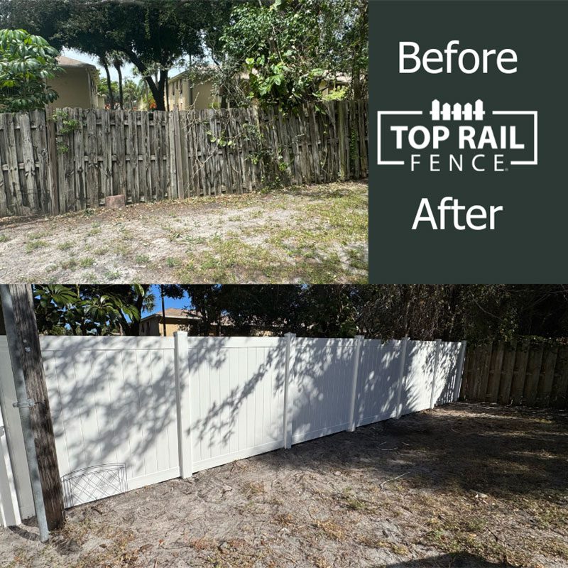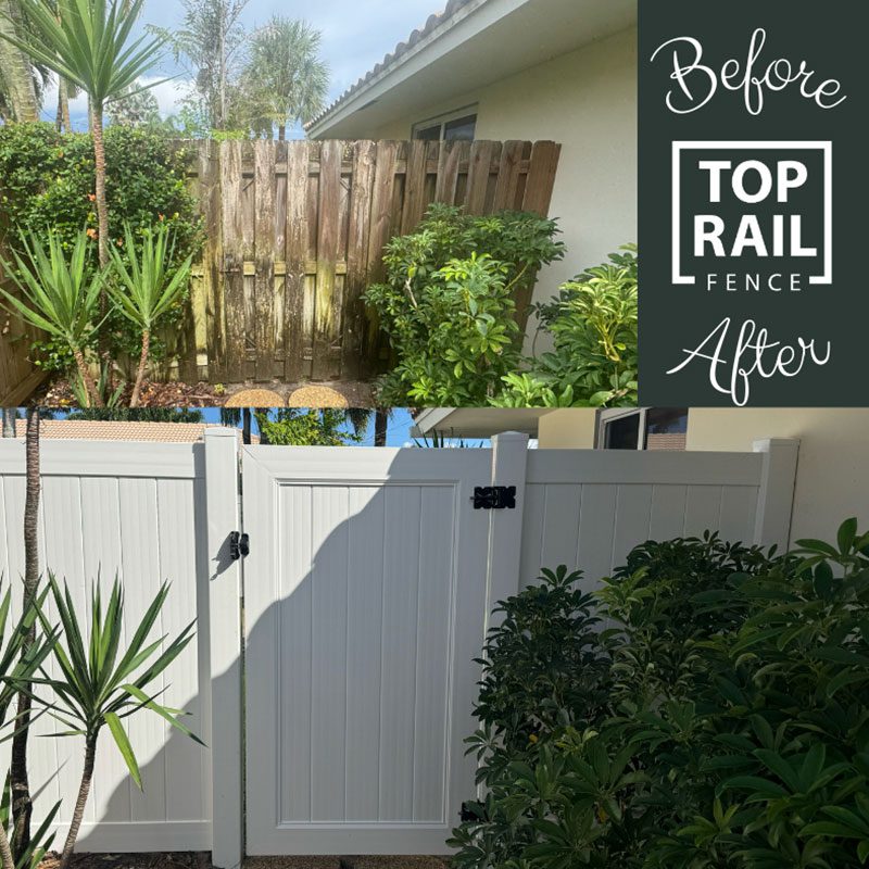 A Boca Raton homeowner wanted to replace an old, worn-out wood shadowbox fence with a more durable and modern solution. Top Rail Fences of West Palm Beach installed 95 feet of 6ft tall white privacy vinyl fencing, including a 4ft wide gate. Vinyl fencing gives a clean and polished look that enhances privacy and curb appeal. We also handled the permitting process, ensuring a hassle-free experience for the homeowner.